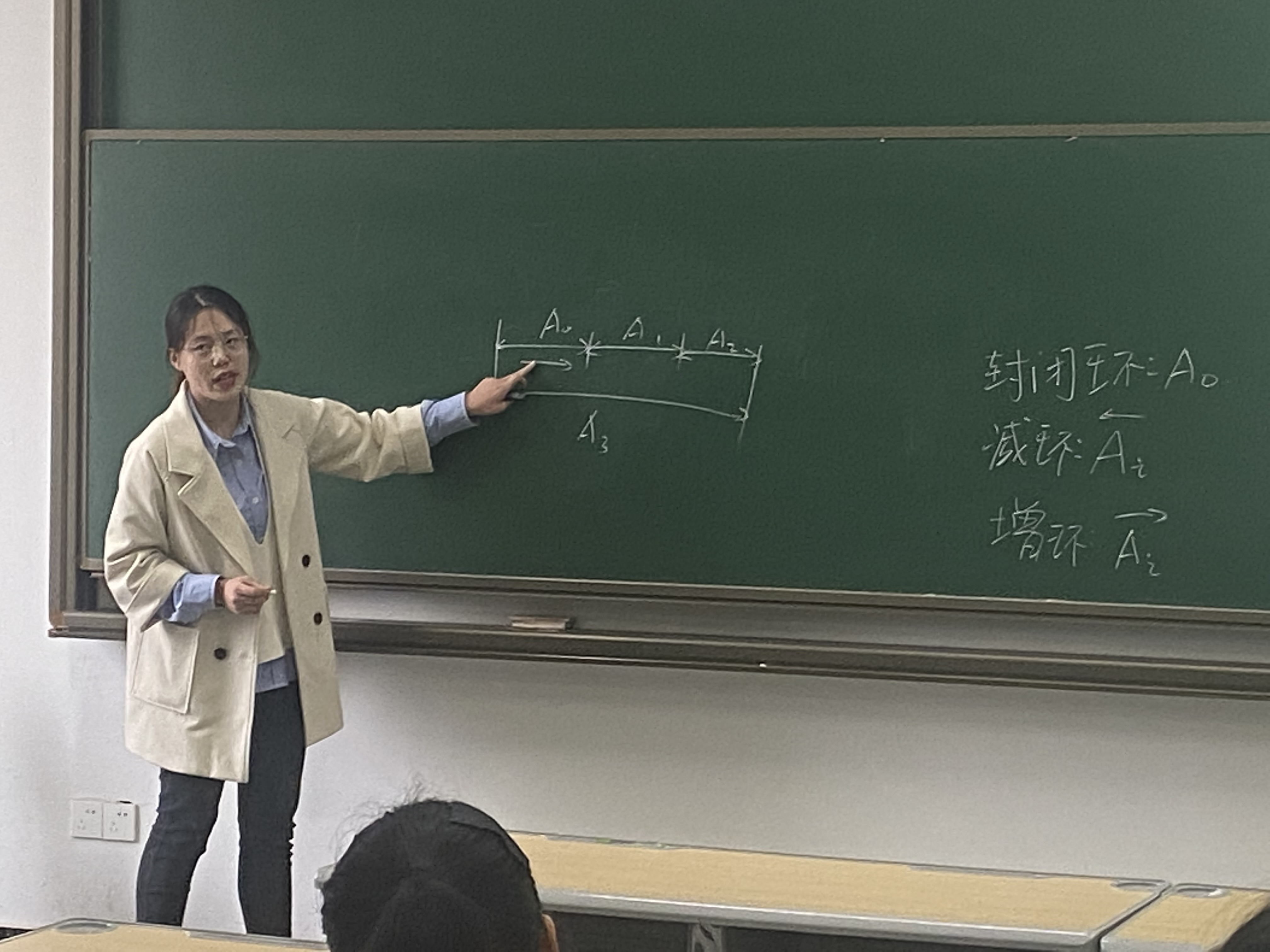 介绍完学科竞赛的基本情况后,由孔丹老师讲解本周公开课。孔丹老师以“工艺尺寸链”为中心,讲解了尺寸链定义、尺寸链特性、组成环增减性等相关知识点。讲解过程中,孔丹老师以定义为先导,结合例题加深学生的理解,最后练习题上应用,形成了知识学习的闭环。抑扬顿挫的语调以及与学生实时的互动,提升了课堂的效率,给新入职的教师提供了一个非常好的示范。