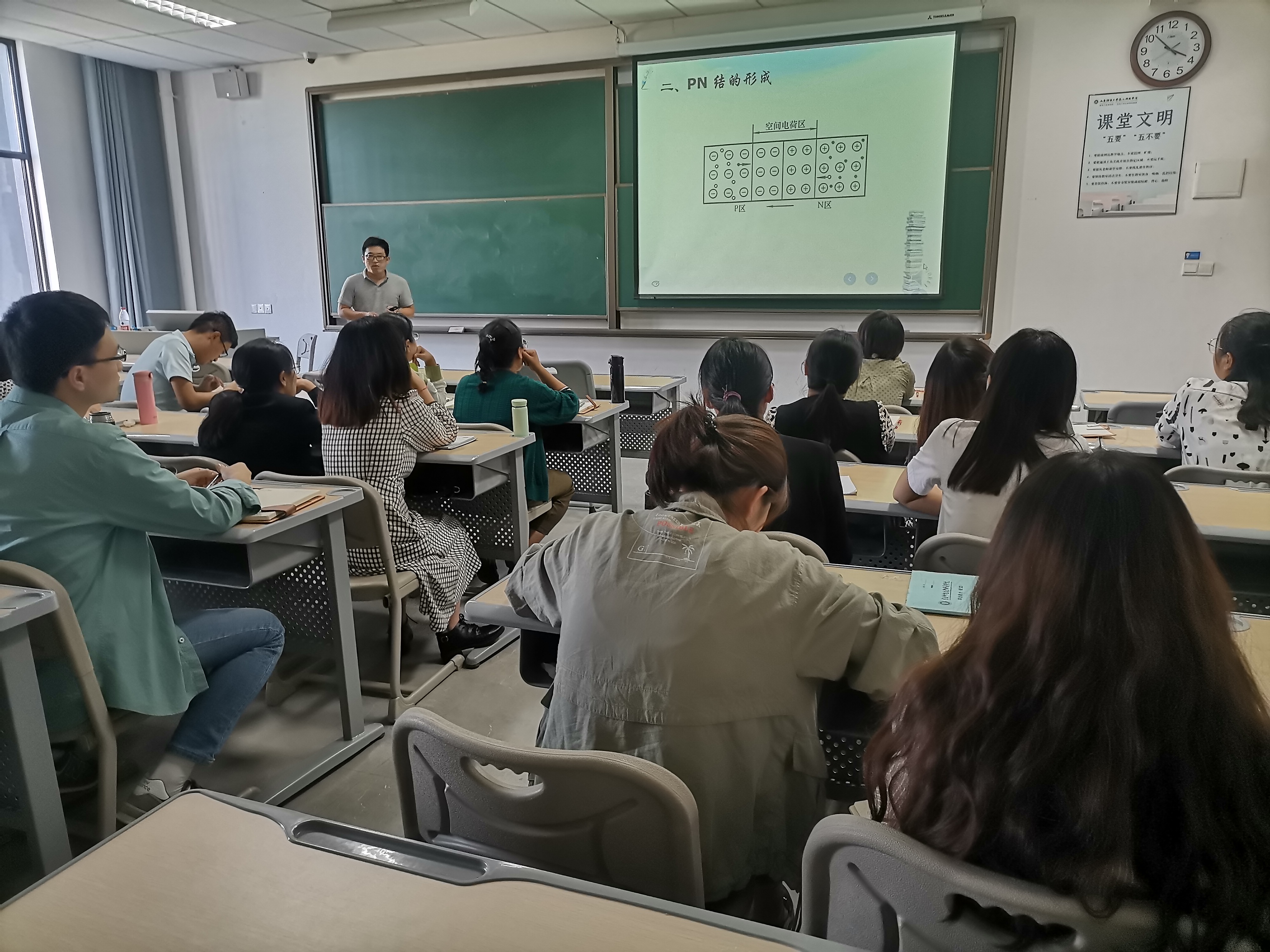 韩良老师选取了《PN结的形成》作为此次示范课的教学内容。韩老师运用简洁明了的教学语言,结合精美的课件展示,清晰地展示了授课内容,整个教学过程环环相扣、引人入胜。这节示范课充分体现了韩老师扎实的教学基本功,强大的驾驭课堂能力,体现了教师为主导,学生为主体的教学观念。整节课中韩老师教学手段运用恰到好处,通过“学习通”软件的使用,使得枯燥乏味的电路课程生动起来,吸引了学生的注意力,同时还有利于学生对教材的理解。同时韩老师的课件做得十分的生动形象,有很多有趣味性和知识性的动画,有些较难理解的部分,通过动画形式的演示,可以使学生较为容易的接受。