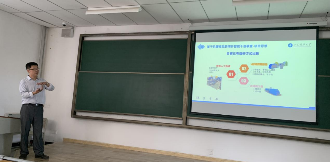 第三部分胡教授讲解并展示了实验室相关比赛设备以及多年来参加过的一些比赛,然后以“互联网+”基于机器视觉的煤矸智能干选装置的项目为例进行讲述,这让青年教师们对比赛全过程及注意事项有了更深入的了解。