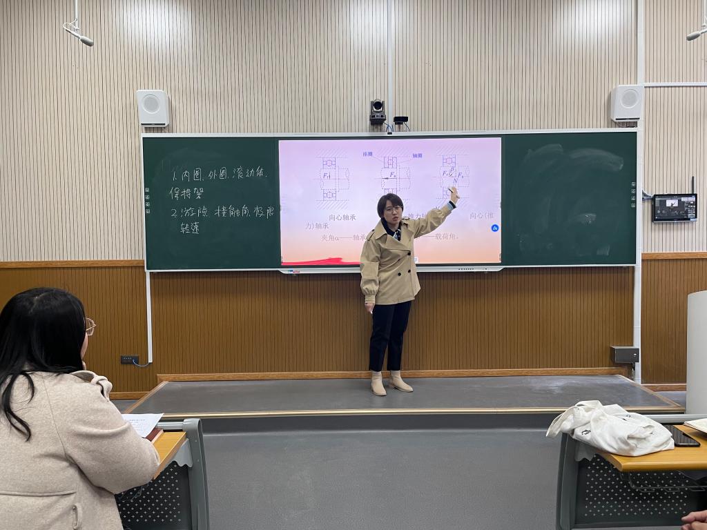 娄老师选取了《机械设计》课程中“滚动轴承的主要类型及其代号”的有关内容进行示范。为使观摩教师尽快了解所讲课程,娄老师在示范课前从课程分析、学情分析、教学目标、教学方法和教学过程等方面进行了说课。之后,娄老师从大家熟知的自行车构造里面的轴承引出本次示范课主题,采用讲授法讲解滚动轴承的基本组成、三个维度进行滚动轴承类型的划分、以表格的形式呈现各类滚动轴承的主要特点、练习法巩固加深滚动轴承代号的组成,借助学习通平台给同学们布置思考题作业。示范课最后,娄老师以神舟十五号载人飞船为例的中国航天工程引导学生“学而思、思而践、践而悟”。