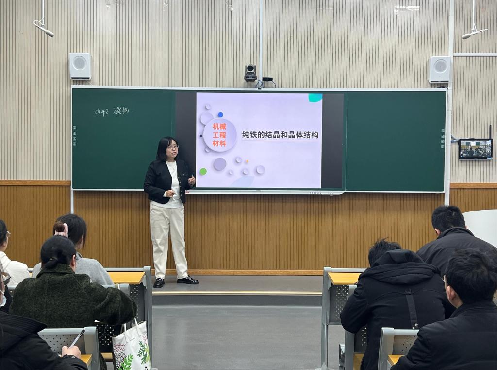 本次课程,毛秋英老师选取了《机械工程材料》课程中“纯铁的结晶和晶体结构”的内容进行示范。毛老师首先以碳钢内部结构的微视频为切入点,激发学生对课程的学习兴趣。在讲解过冷现象、晶体的结构与性能时,结合生活实际和生产实践,引导学生将理论与实践相结合,做到学以致用。讲解单晶体时,毛老师紧扣时代主题, 以硅单晶生产制备的案例进行分析,引导学生们深入思考机械设备发展面临的技术问题,学生在思想上得到了深刻的启迪。
