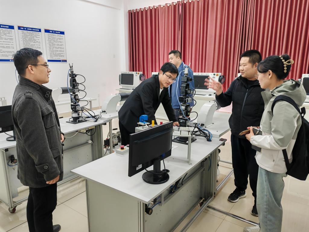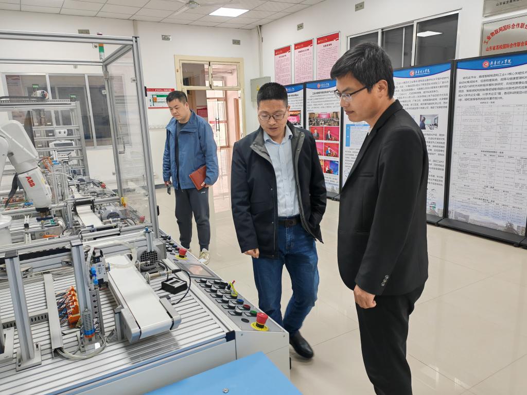 随后,张院长一行前往齐鲁理工学院智能制造与控制工程学院,受到了副院长雷腾飞和智能制造教研室主任孔贝贝的热情接待。他们参观了该学院的工业大数据与实验教学中心以及智能制造技术中心。这些中心拥有先进的实验设备和技术平台,为学生提供了丰富的实践机会,并致力于推动智能制造领域的教学与科研工作。