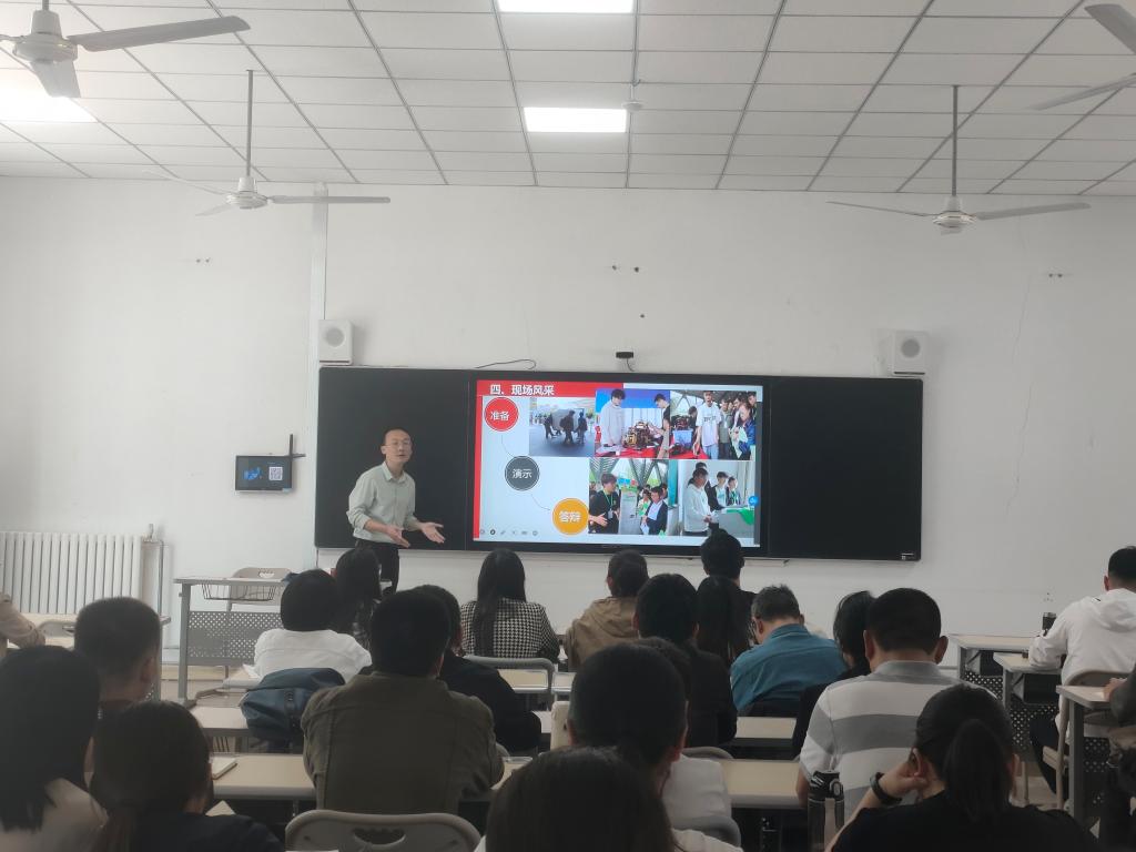 接下来,张磊老师对“第十一届全国大学生机械创新设计大赛暨慧鱼工程技术创新设计大赛”作参赛汇报。汇报中,首先介绍了比赛流程包括:选题、设计、制作、调试、报名、准备、演示、答辩;接下来向大家分享了专家建议与赛中优秀作品。