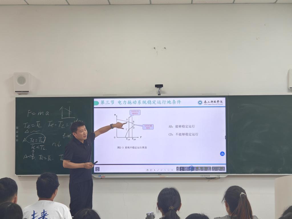 本次教师公开课由电气工程教研室李臣老师进行讲授。李老师选择了《电机拖动与控制》课程的“电力拖动系统稳定运行的条件”为授课内容。课堂上,李老师通过电力拖动系统的运动方程为基础,深入讲解了系统稳定运行的基本工作原理和系统不稳定运行状态。整个讲解过程详细完整,讲解思路清晰、知识点由浅入深,逻辑性很强,展现了一堂完整的教学公开课。