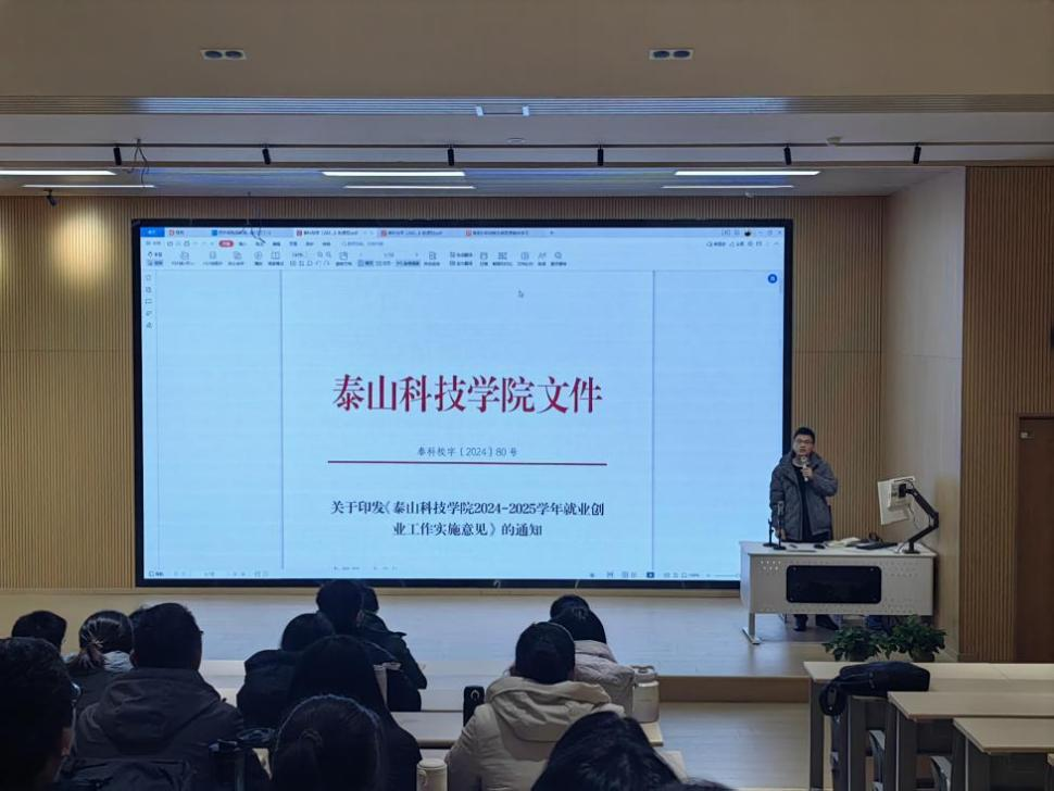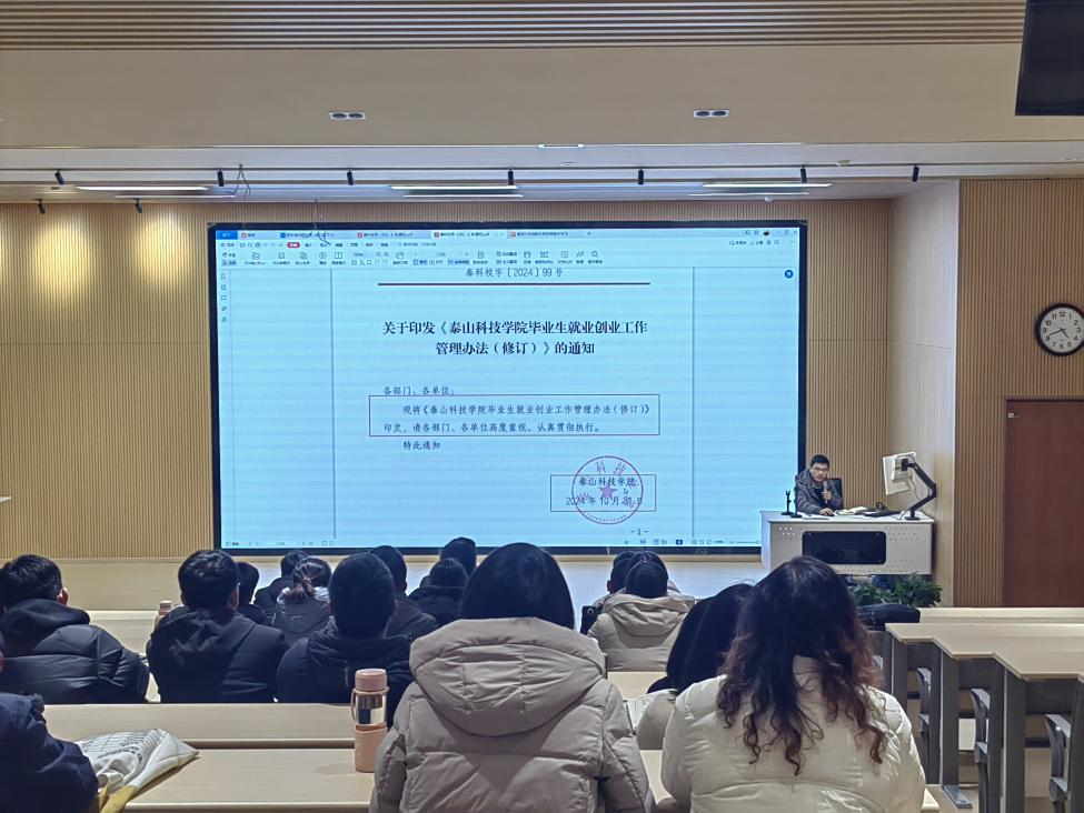 最后,张涛然带领大家认真学习并解读了泰科校字〔2024〕80号《yl7703永利集团2024-2025学年就业创业工作实施意见》和泰科校字〔2024〕99号《yl7703永利集团毕业生就业创业工作管理办法(修订)》两个就业创业工作开展的指导文件。
