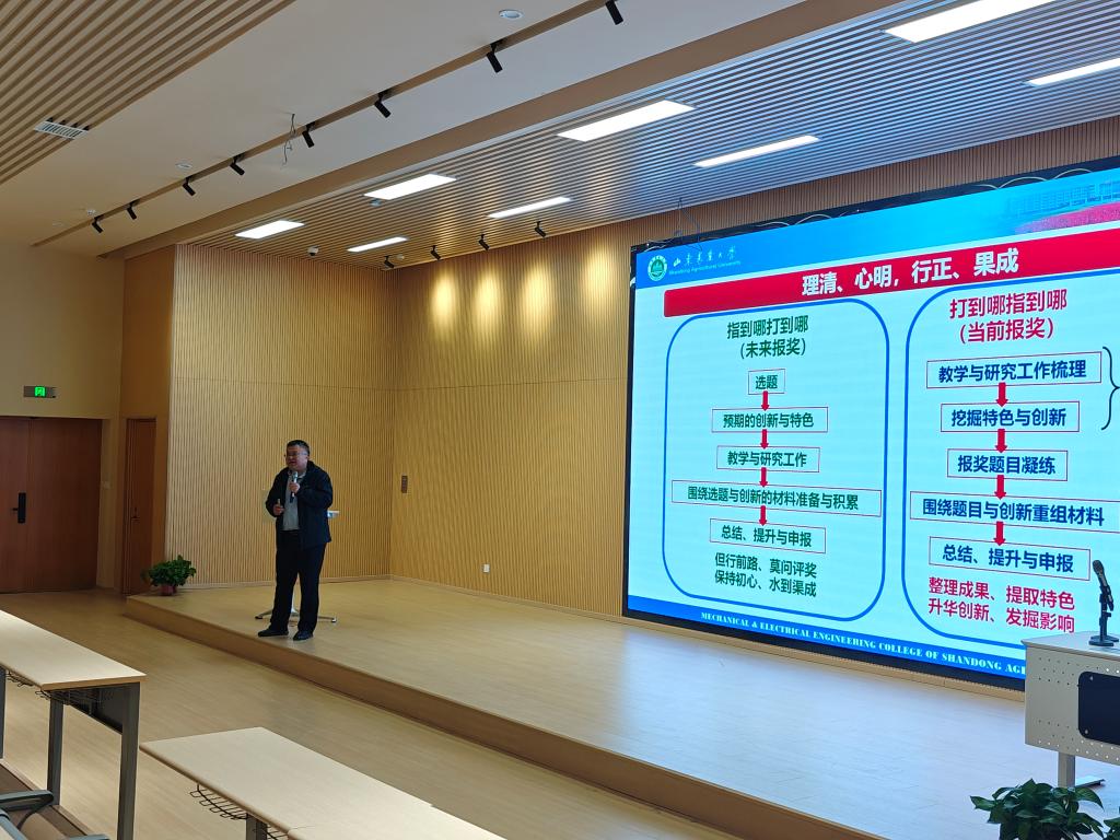 此次培训邀请山东农业大学机械与电子工程学院副院长、国家农业机械化及其自动化虚拟教学示范中心主任宋月鹏教授进行了主题分享。宋教授以其丰富的教育经验和丰硕的教学成果,详细剖析了获奖案例的特征和成功经验。他不仅分享了个人在教学工作中的心得与体会,还介绍了如何运用先进的教学理念和方法,提高教学水平和质量。