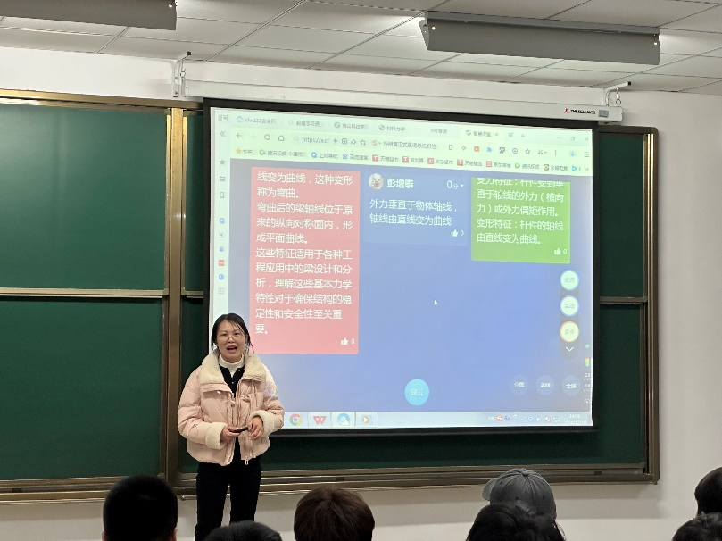 卢雪老师从弯曲变形的基础概念出发,逐步深入到梁的力学模型简化及弯曲内力的求解,通过工程中及生活中的相关梁结构的案例,深入浅出地对知识点进行了讲解,让大家对梁的弯曲内力有一个全面而深刻的认识。课堂上,通过小组合作、主题讨论等形式,营造了一个开放、包容的学习氛围,有效提升了教学效果。