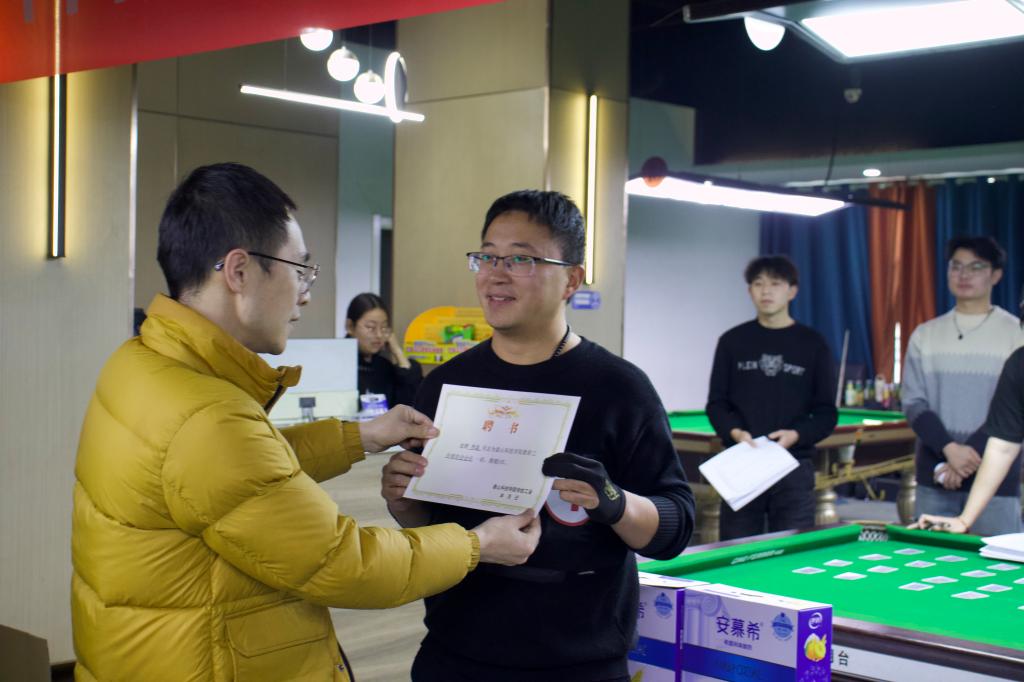 赛事在策划过程中,得到了教职工的广泛关注。学校工会依托本次赛事,牵头组织参赛教职工成立“小泰教职工台球俱乐部”,聘请财务处李磊担任俱乐部会长。白军彭为李磊颁发聘书,现场参赛选手向首任会长鼓掌祝贺。李磊表示,他将全力以赴,带领俱乐部成员共同推动台球运动在校园内的普及和发展,为教职工们提供一个更加广阔的交流和展示平台。