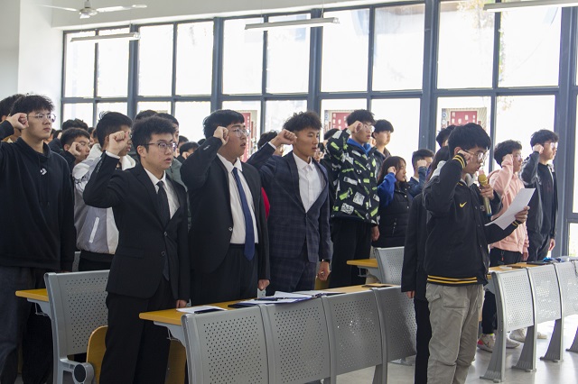 汇报结束后,两院全体成员举行了庄严的宣誓仪式,面对鲜红的团旗和两院旗帜,组织部张喆带领朝气蓬勃、意气风发的第16届团总支·学生会成员宣誓,从铿锵有力的誓词中可以看出大家对服务同学、建设学院的极大热情和向往,彰显了新一届学生会成员的良好精神风貌和昂扬斗志。