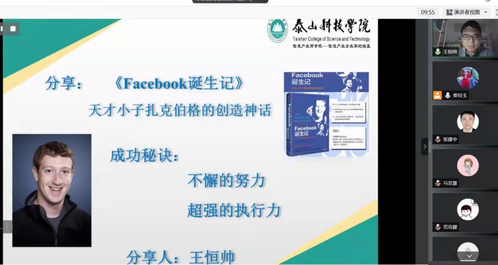 王恒帅老师分享了《Facebook诞生记》,对整个Facebook从创立之初到举世闻名这个整个历程进行了回顾。对于马克·扎克伯格成功经验,王老师总结为两点:自身的努力和自身强大的执行力。王老师提到通过阅读此书,深刻的认识到,不管从事什么行业,只有真正掌握核心竞争力的人才能站稳脚跟走到最后。并通过这次阅读分享,希望大家能养成坚持读书的习惯,深入地了解管理者的思维,与大咖深度对话,在阅读中思考,在思考中感悟。
