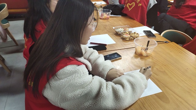 三位志愿者代表上台进行精彩的分享后,志愿者王兴瑞邀请观摩志愿者们一同观看了本学年两学院志愿服务活动的回顾与总结视频。同时,让观摩志愿者们写下自己的心得感悟,希望志愿者们能够一如既往地继续支持志愿服务的各项工作,积极参加学校建设和公益活动,为更美好的未来贡献出自己的一份力量。