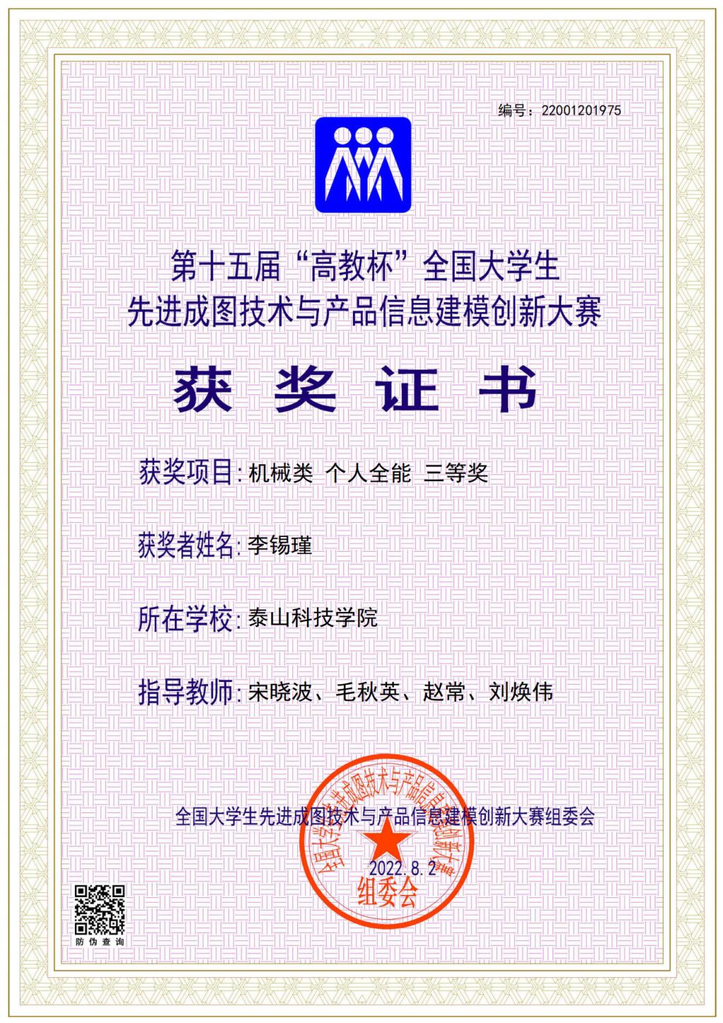 国家级个人赛荣誉证书